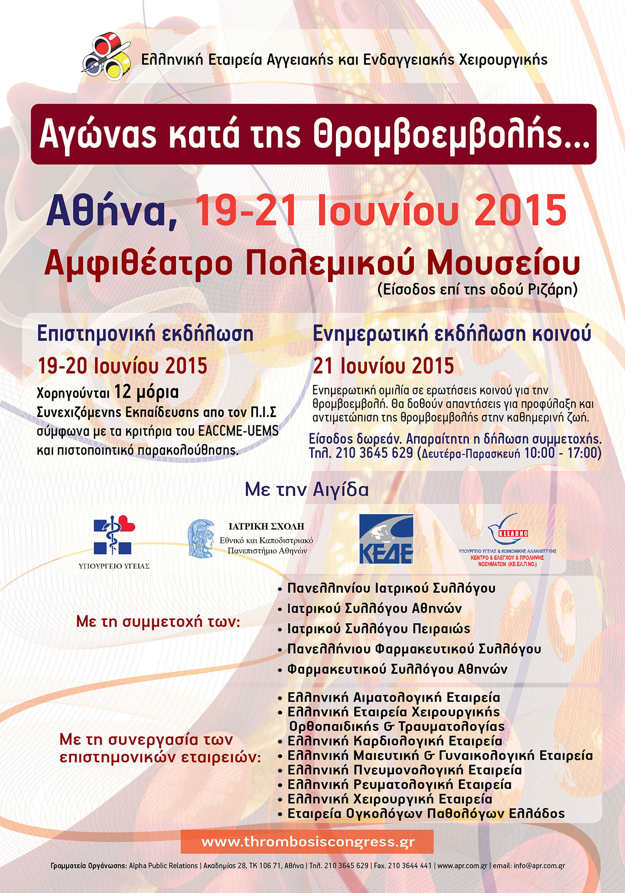 Η Ελληνική Εταιρεία Αγγειακής και Ενδαγγειακής Χειρουργικής έχει τη χαρά και την τιμή να σας ανακοινώσει τη διοργάνωση επιστημονικής διημερίδας με θέμα "Αγώνας κατα της Θρομβοεμβολής" η οποία θα διεξαχθεί 19-21 Ιουνίου 2015 στην Αθήνα στο αμφιθέατρο του Πολεμικού Μουσείου (Ριζάρη 4, Αθήνα).