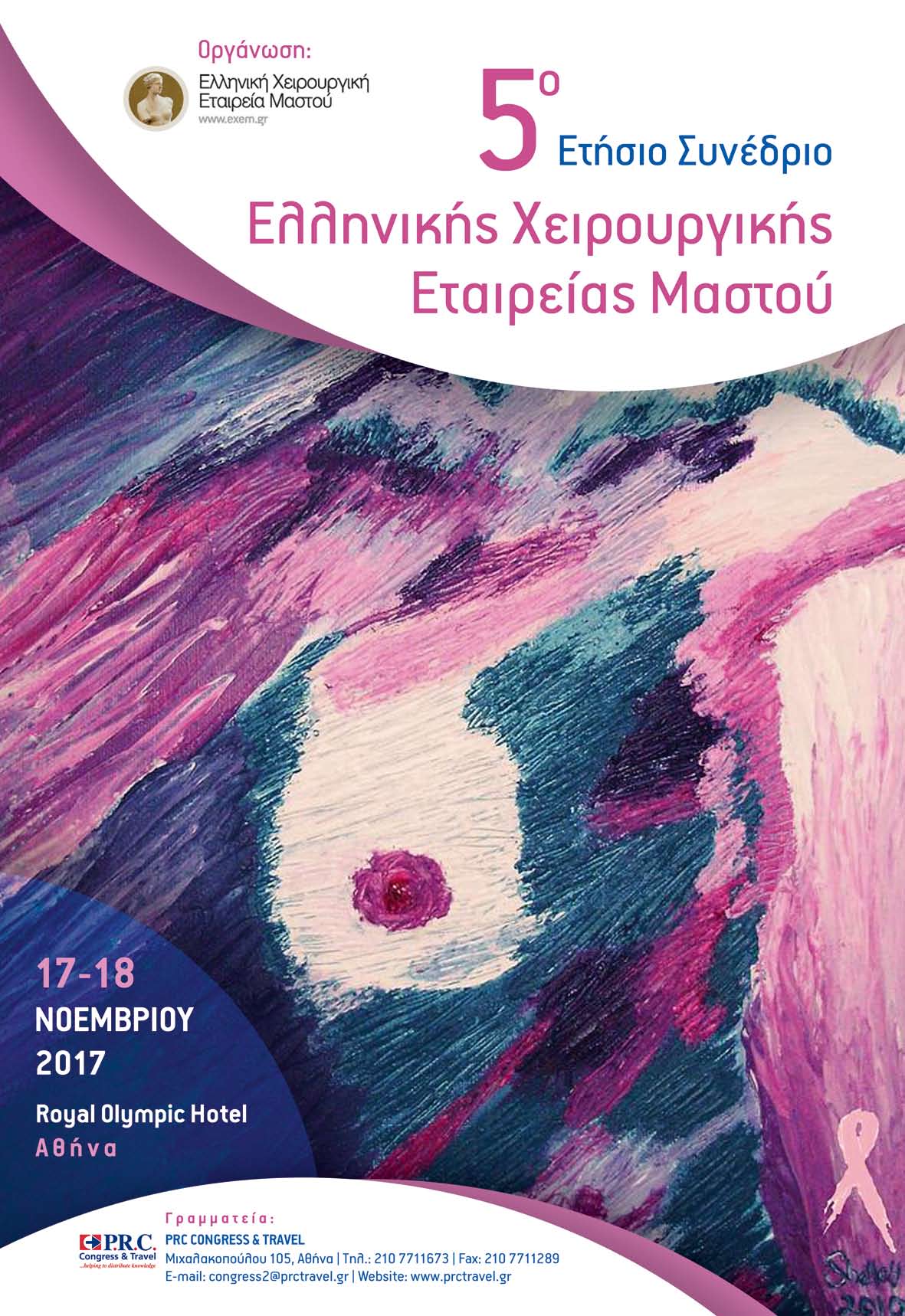 afisa-50-etisio-sinedrio-exemΜε το παρόν επιθυμούμε να σας γνωστοποιήσουμε την διεξαγωγή του 5ου Ετήσιου Συνεδρίου της Ελληνικής Χειρουργικής Εταιρείας Μαστού το οποίο θα πραγματοποιηθεί στην Αθήνα, στο ξενοδοχείο Royal Olympic από 17 έως 18 Νοεμβρίου 2017.